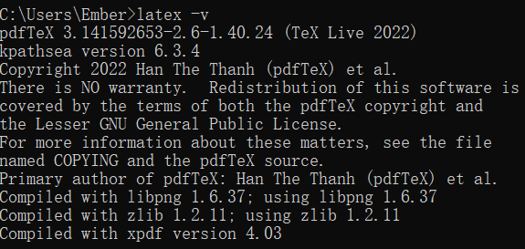 配置完成后在命令行输入 latex -v ,出现如下信息则判断 latex 安装及配置完成