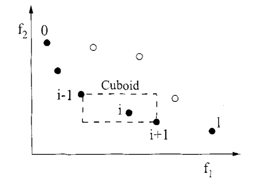 在计算拥挤距离之前,需要对每个目标函数进行归一化。拥挤距离的计算需要根据每个目标函数值按升序对总体进行排序。然后,对于每个目标函数,边界解 (函数值最小和最大的解) 被分配一个无限距离值。所有其他中间解都被赋一个距离值,等于两个相邻解函数值的归一化绝对值差(自我理解:即上图中的长与宽之和)。对所有目标函数均进行该操作。整体拥挤距离值计算为每个目标对应的个体距离值之和。
