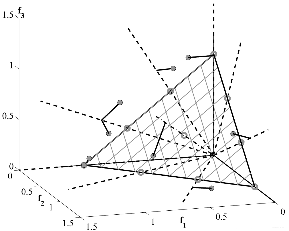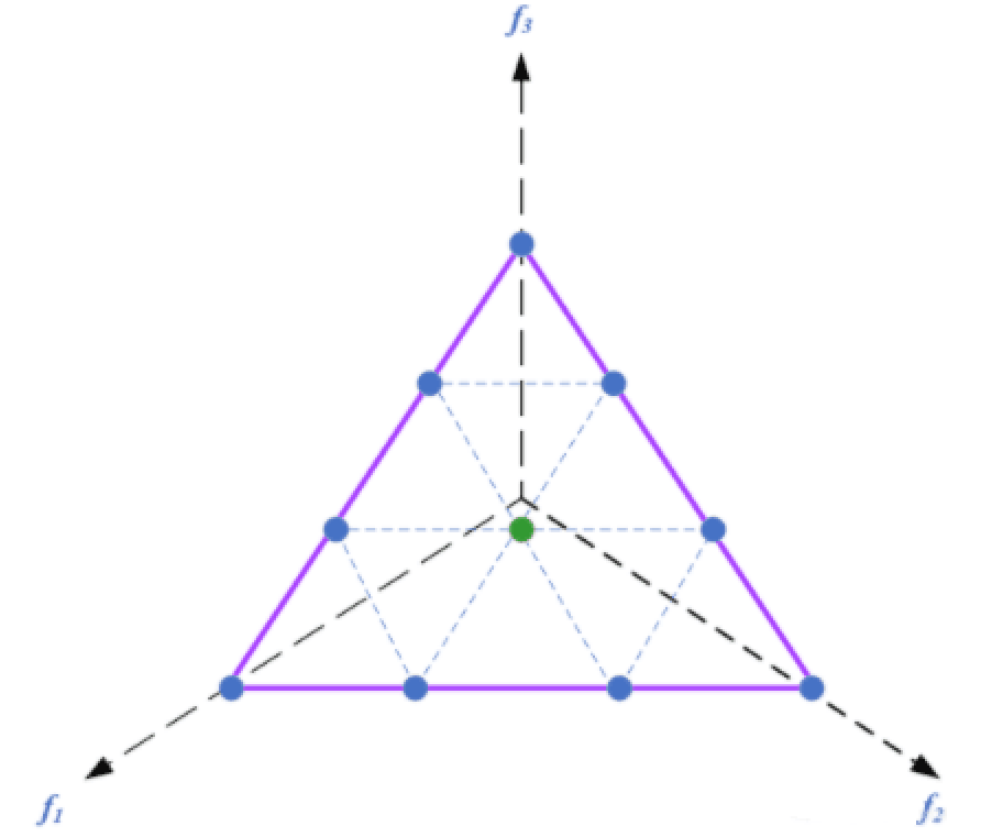 注意:1. 中间参考点的计算坐标过程是独立的;2. 参考点总个数为;3. 建议当 时,用 Das and Denni's 方法,其它情况用 Deb and Jain's 方法。