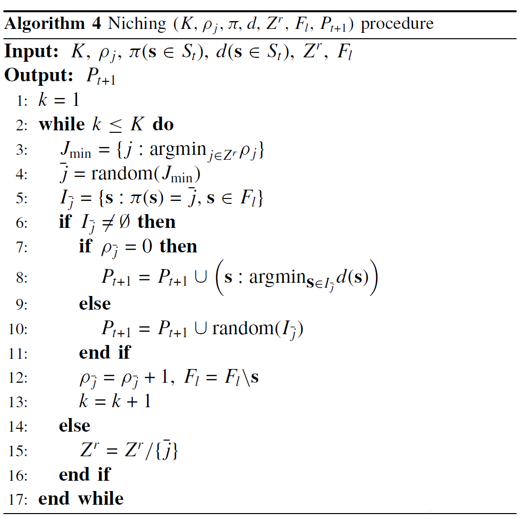 上边我们构建了种群个体与参考点之间映射关系,获取了每个种群个体距离最小的参考点以及它们之间的距离。前边都是热身工作,接下来,我们正式对最后一前沿种群个体进行操作,筛选最后一前沿种群个体。小生境保留操作的过程如下: