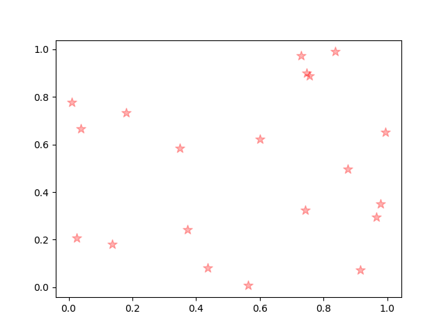 plt.scatter(x, y, s=100, c='r', marker='*', alpha=0.3) | |