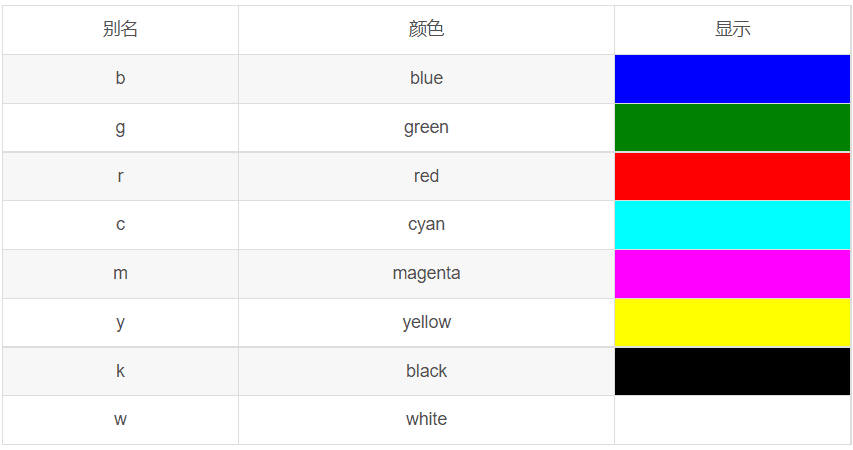 matplotlib 有八个基本颜色,可以用单字符串来表示,分别是 ‘b’, ‘g’, ‘r’, ‘c’, ‘m’, ‘y’, ‘k’, ‘w’ ,对应的是 blue, green, red, cyan, magenta, yellow, black, and white 的英文缩写,如下图所示: