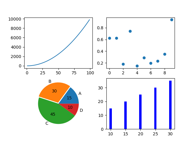 ax3.pie(x=[15, 30, 45, 10], labels=list('ABCD'), autopct='%.0f', explode=[0, 0.05, 0, 0]) | |