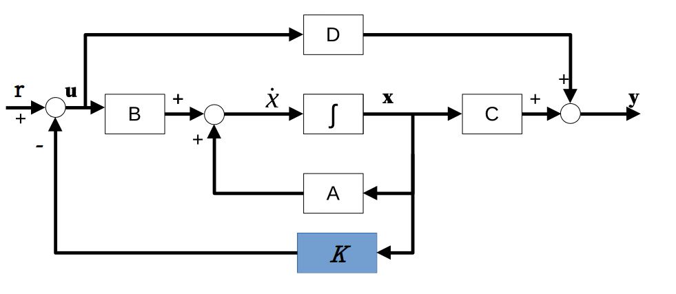 LQR 控制通过设定一个线性反馈控制器,用以得到输入参数 和状态变量 的关系,全状态反馈控制器的状态空间描述框图如下图所示: