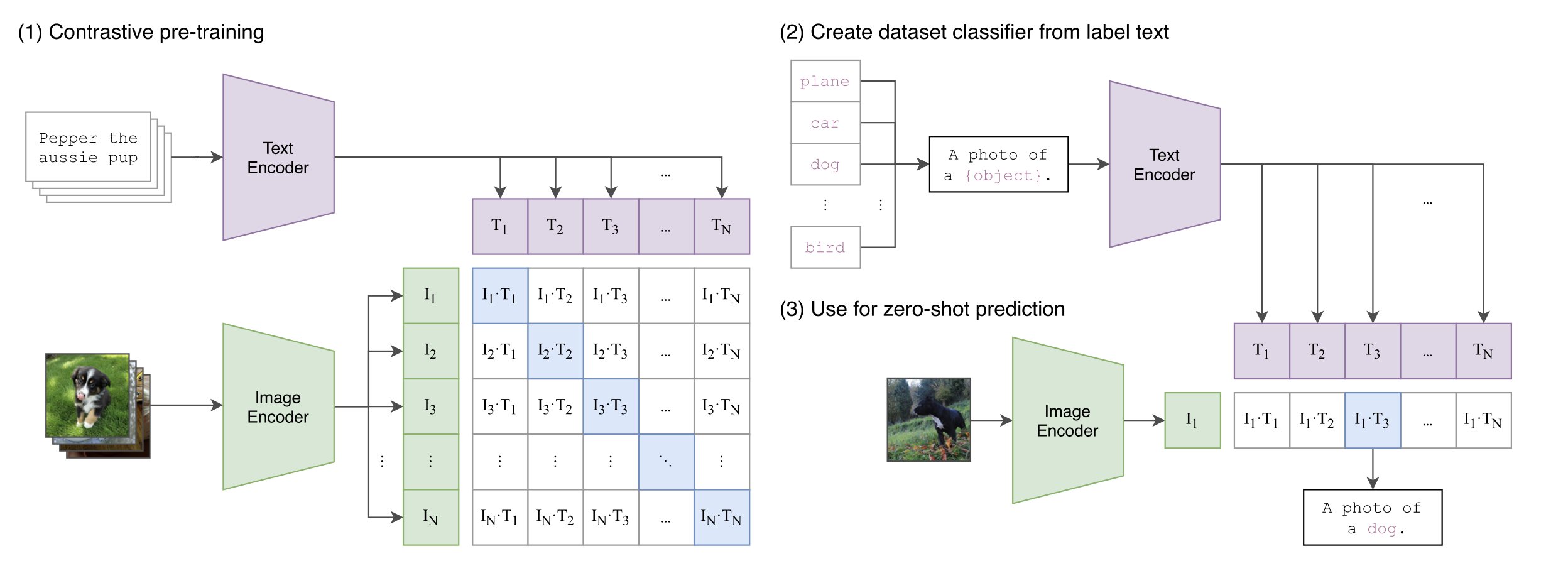 如下图所示, CLIP 的输入是一对对配对好的的图片 - 文本对(比如输入是一张狗的图片,对应文本也表示这是一只狗)。这些文本和图片分别通过 Text Encoder 和 Image Encoder 输出对应的特征。然后在这些输出的文字特征和图片特征上进行对比学习。