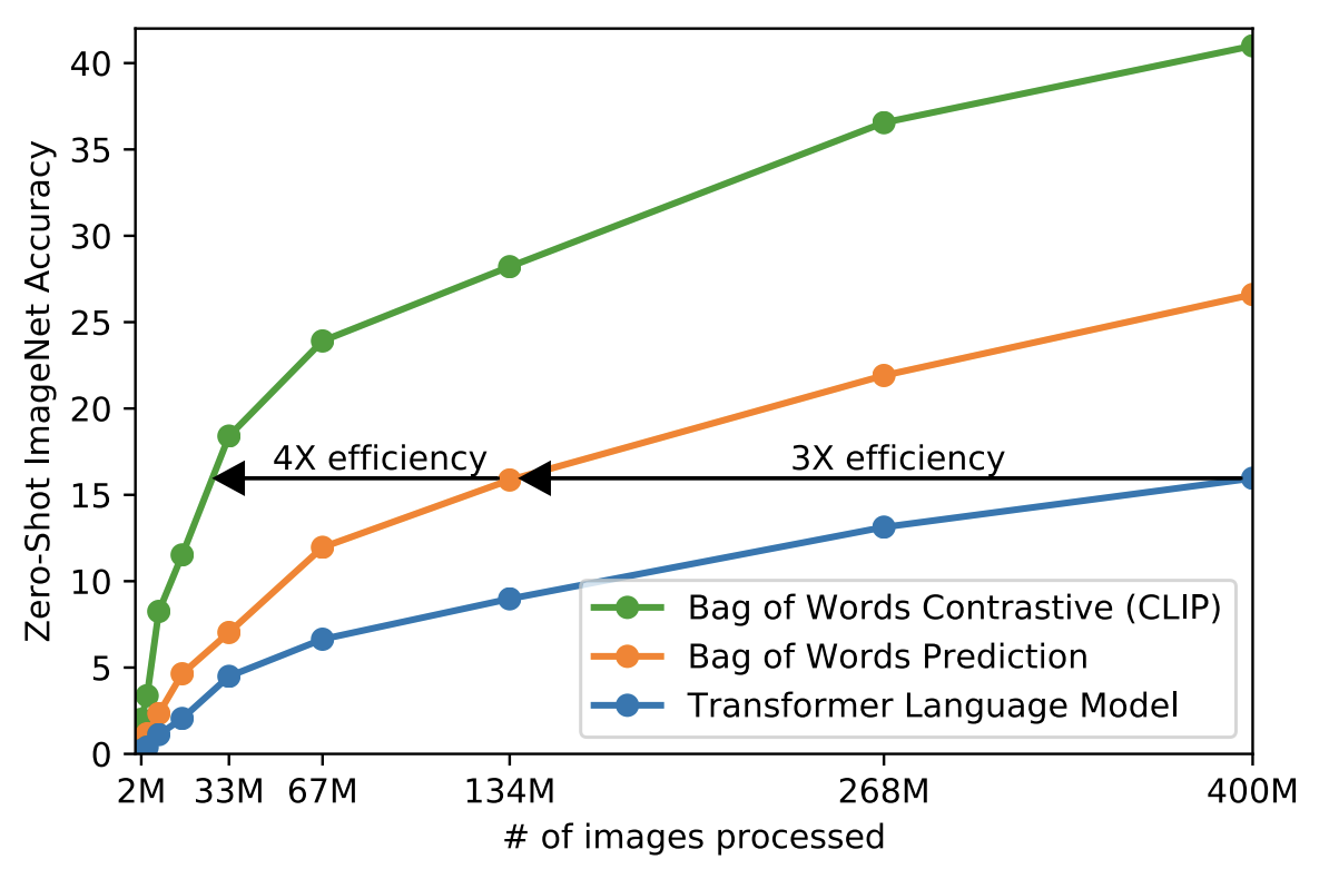 CLIP:简化版的ConVIRT,基于对比学习。只需要判断图文是否配对,进一步简化了训练任务,训练效率一下子提升4倍(绿色线)训练任务更加合理。因为训练数据所包含的文本 - 图像对是从互联网收集来的,它们存在一定的噪音,二者并不完全匹配。适当的降低训练目标,反而能取得更好的收敛。