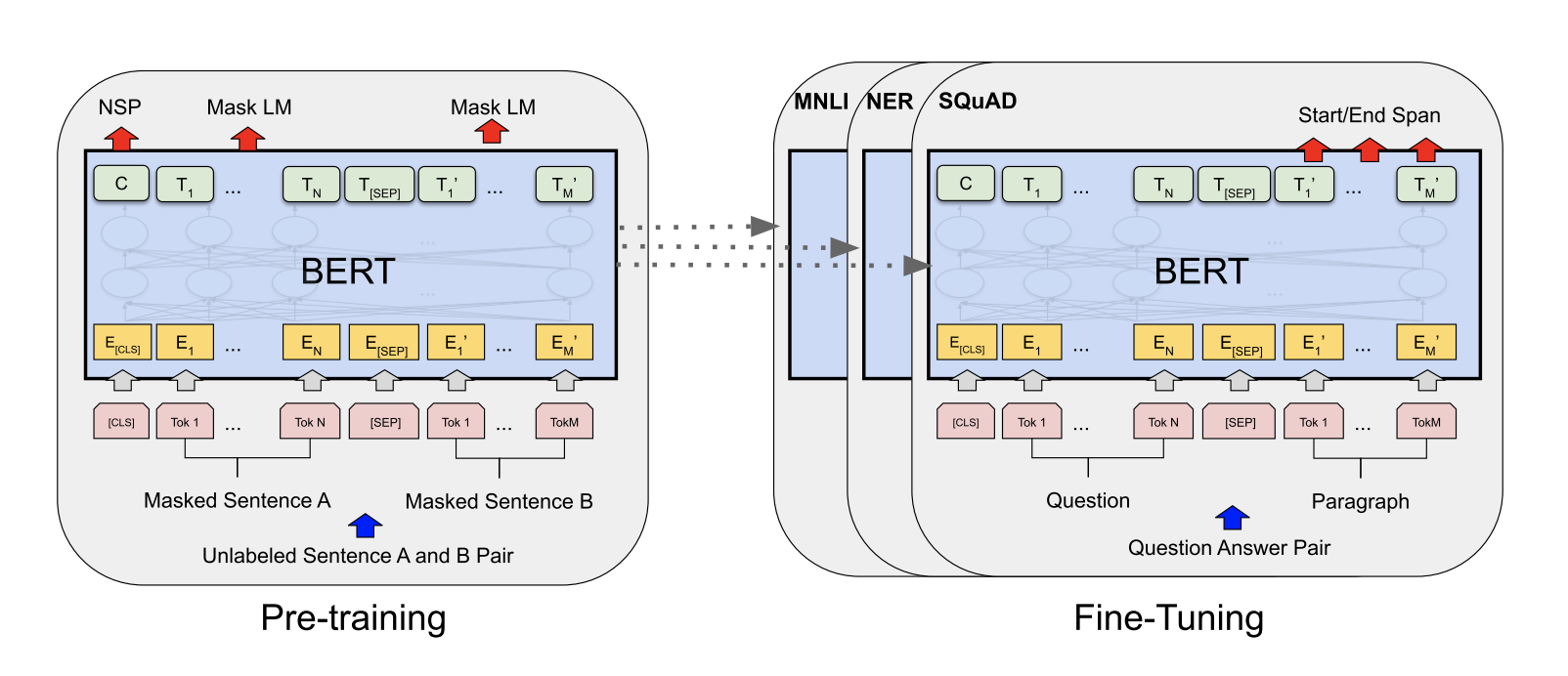 BERT 的框架中有两个步骤:预训练和微调。在预训练过程中,模型在不同的预训练任务上对未标记数据进行训练。对于微调,首先使用预训练的参数初始化 BERT 模型,然后使用来自下游任务的标记数据对所有参数进行微调。每个下游任务都有单独的微调模型,即使它们是用相同的预训练参数初始化的。