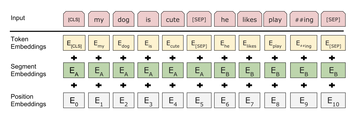 对于给定的 token , BERT 输入表示是通过将相应的 token 、 segment (段) 和 position (位置) embedding 相加来构建的。图 2 显示了该结构的可视化。