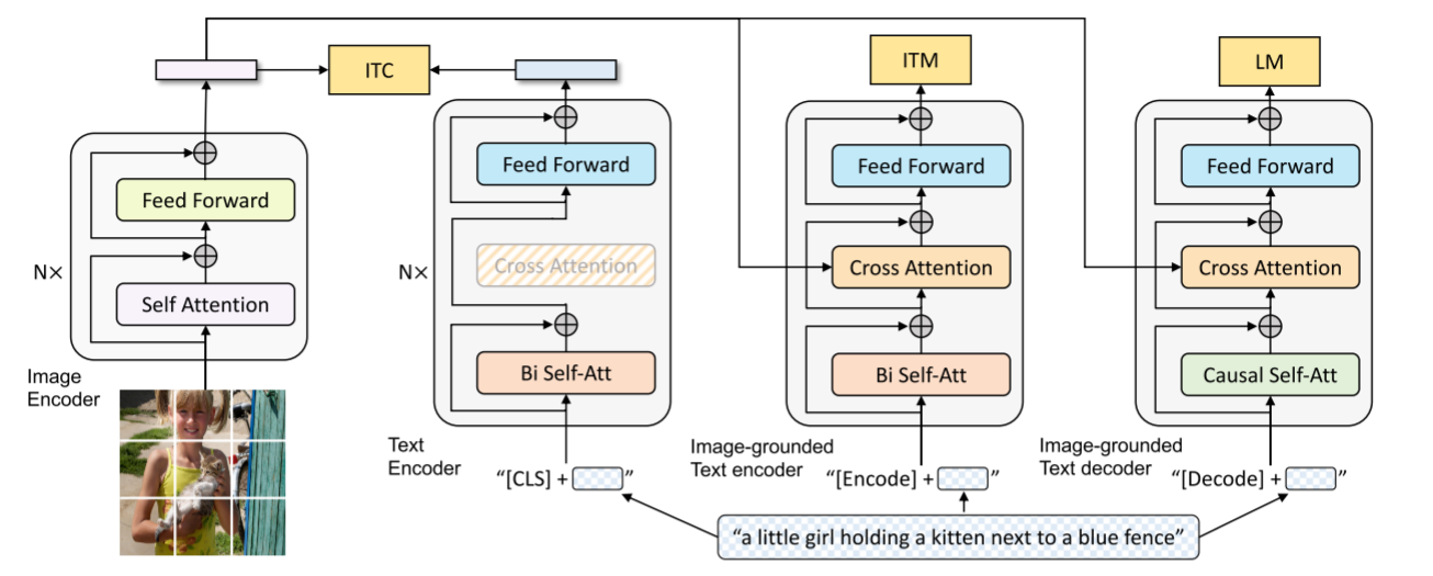 MED, Multimodal mixture of Encoder-Decoder): 一种有效的多任务预训练和灵活迁移学习的新模型架构。MED可以作为单模编码器、基于图像的文本编码器或基于图像的文本解码器操作。该模型采用图像文本对比学习、图像文本匹配和图像条件化语言建模三个视觉语言目标进行联合预训练。 -