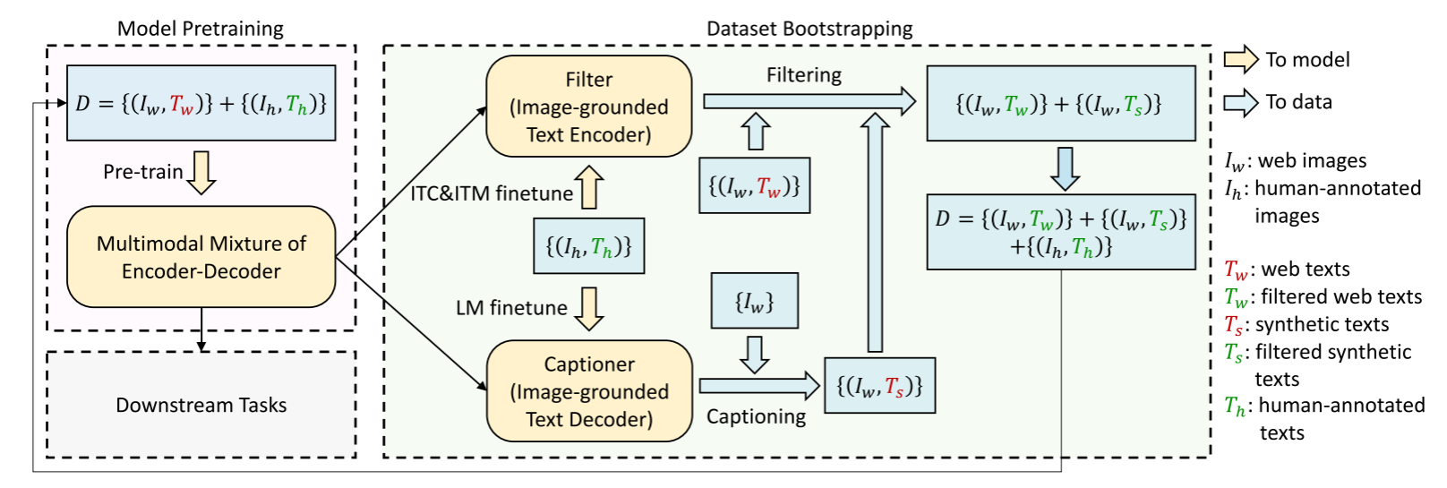上图给出了 CapFilt 的图示,包含字幕器和过滤器两个模块: