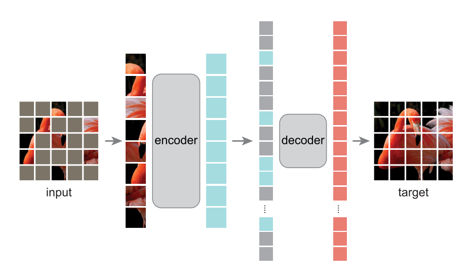 Encoder-Decoder架构,其中一个Encoder只对可见的patch子集进行操作 (即没有被 mask 掉的 token),另一个简单轻量化的Decoder可以从潜在表征和被 masked 掉的 token 重建原始图像。 - 研究人员进一步发现,Mask 掉大部分输入图像 (例如