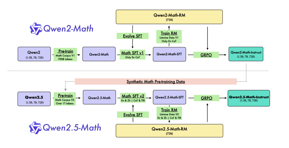 在 Qwen2-Math 基础模型训练之后,通过三个主要途径将其升级为 Qwen2.5-Math 模型: