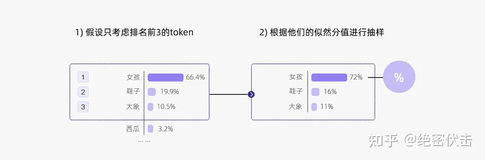 (1)首先设置 top-k = 3,表示保留概率最高的 3 个 token。这样就会保留女孩、鞋子、大象这 3 个 token。