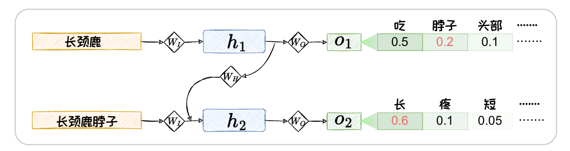 但上述 “自回归” 过程存在着两个问题:(1)错误级联放大,选用模型自己生成的词作为输入可能会有错误,这样的错误循环输入,将会不断的放大错误,导致模型不能很好拟合训练集;(2)串行计算效率低,因为下一个要预测的词依赖上一次的预测,每次预测之间是串行的,难以进行并行加速。为了解决上述两个问题,“Teacher Forcing” 在语言模型预训练过程中被广泛应用。在 Teacher Forcing 中,每轮都仅将输出结果与 “标准答案”(GroundTruth)进行拼接作为下一轮的输入。如例子中,第二轮循环中,用 “长颈鹿脖子” 来预测下一个词 “长”,而非选用 o1 中概率最高的词 “吃” 或者其他可能输出的词。