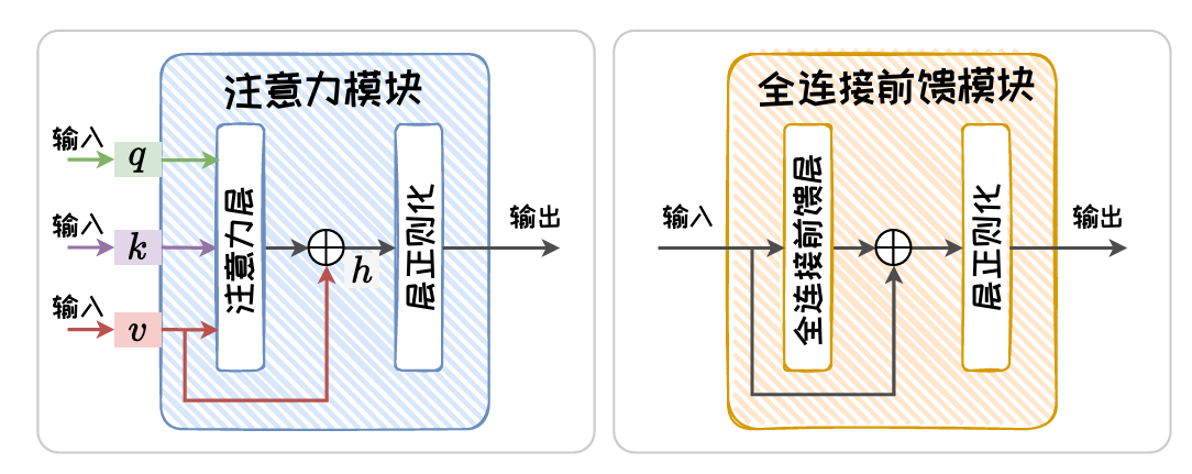 引入残差连接可以有效解决梯度消失问题。在基本的 Transformer 编码模块中包含两个残差连接。 第一个残差连接是将自注意力层的输入由一条旁路叠加到自注意力层的输出上,然后输入给层正则化。第二个残差连接是将全连接前馈层的输入由一条旁路引到全连接前馈层的输出上,然后输入给层正则化。