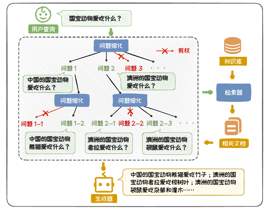 这种渐进式的检索方法能够显著改善大语言模型对模糊问题的生成效果。然而,其需要进行多轮检索并生成多个答案路径,整个系统的计算量会随着问题复杂度呈指数级增长。此外,多轮的检索与生成不仅会带来显著的时间延迟,多个推理路径还为推理带来不稳定性,容易引发错误。