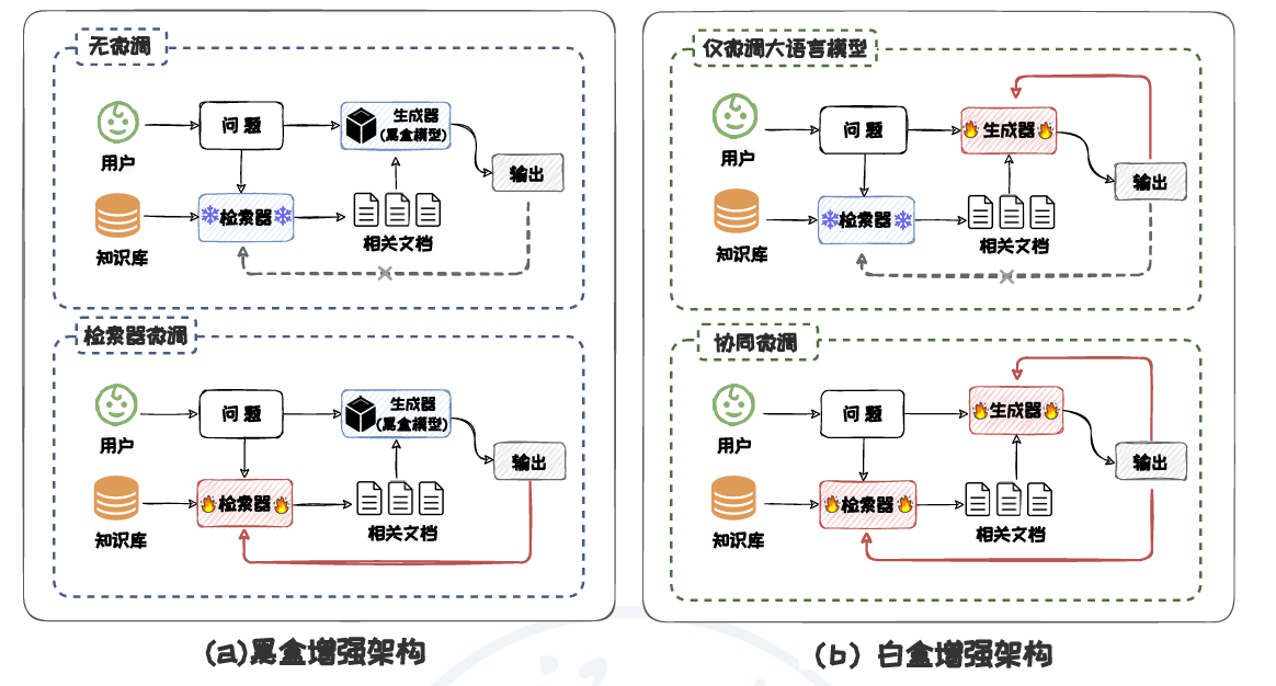 黑盒增强架构可根据是否对检索器进行微调分为两类:无微调、检索器微调。白盒增强架构也可根据是否对检索器进行微调分为两类:仅微调大语言模型、检索器与大语言模型协同微调。