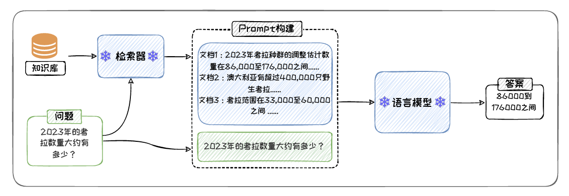 具体而言,给定一个自然语言问题(Query),检索器将问题进行编码,并从知识库(如维基百科)中高效检索出与问题相关的文档。然后,将检索到的知识和原始问题一并传递给大语言模型,大语言模型根据检索到的知识和原始问题生成最终的输出。