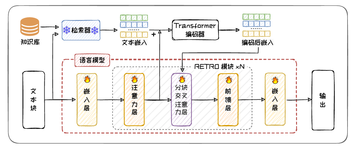仅微调语言模型指的是检索器作为一个预先训练好的组件其参数保持不变,大语言模型根据检索器提供的上下文信息,对自身参数进行微调。RETRO 是仅